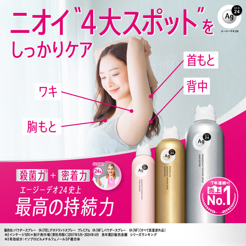 24時間、肌快適ケア。いつでもどこでもずーっと快適な肌を願う人へ。ニオイ菌、集中殺菌(有効成分:イソプロピルメチルフェノールSP複合体)!汗臭対応。ストレス臭*ケア。汗・皮脂対応。高密着処方。*ストレス臭を包み込んで嫌なニオイを目立たなくするSTハーモナージュ香料配合。L、大人っぽく華やかな香りフローラルブーケ、(販売名:パウダースプレー fA(FB))
