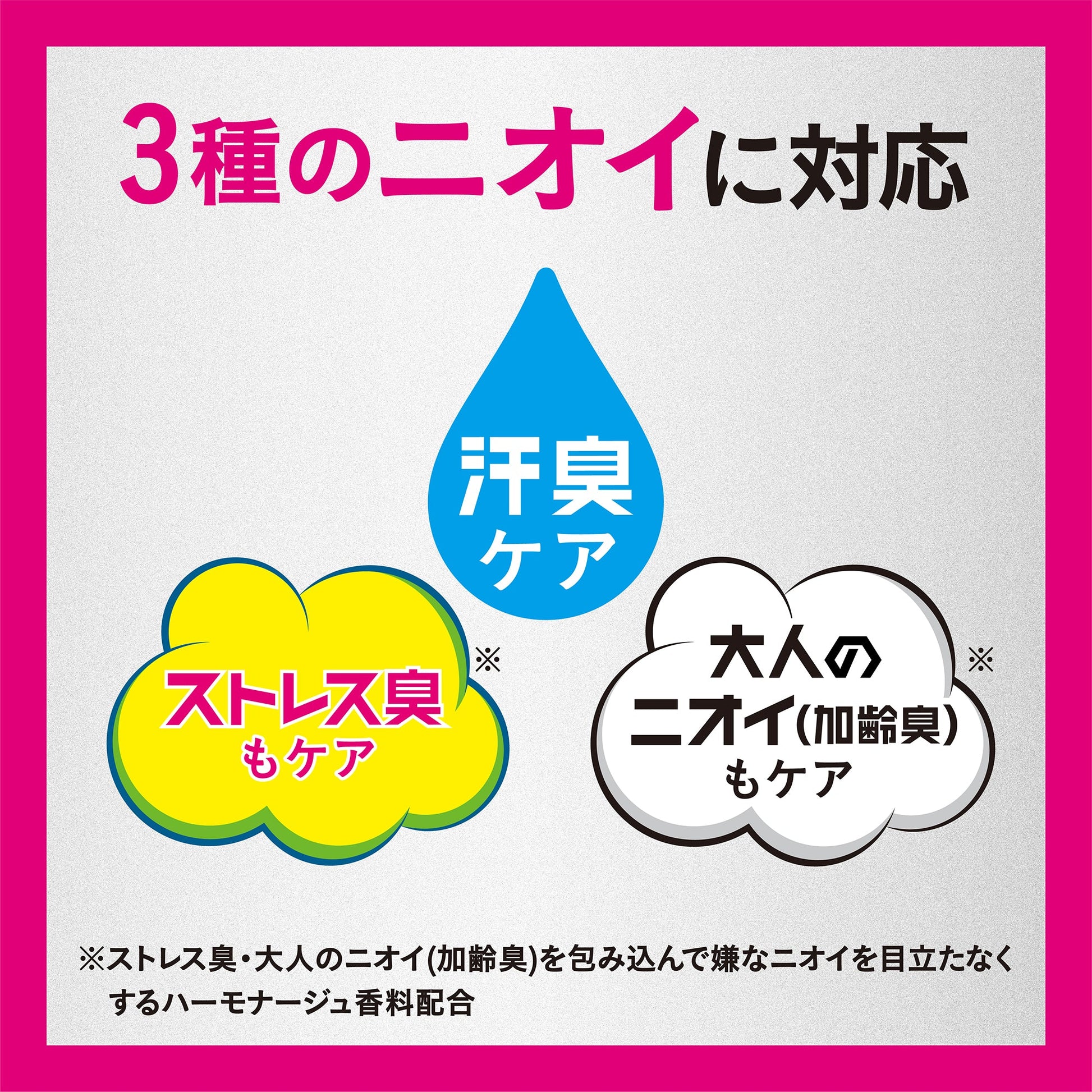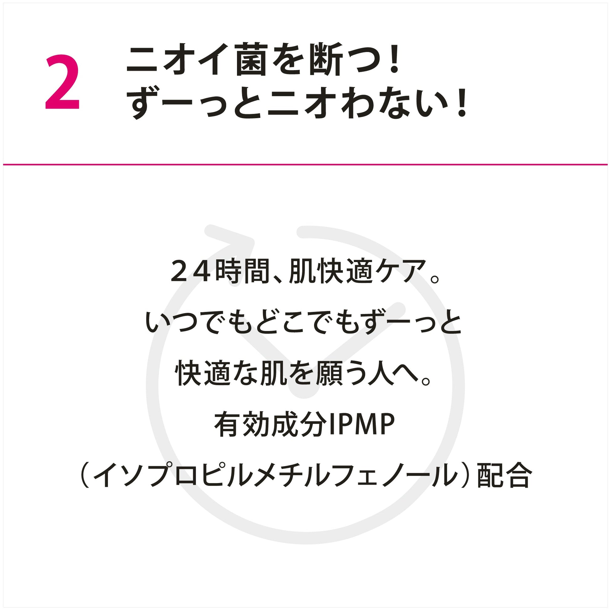 ニオイ菌、集中殺菌!ワキ・首筋・胸もと・背中などの全身の汗のニオイ・体臭を元から防ぐ(有効成分:IPMP(イソプロピルメチルフェノール))。