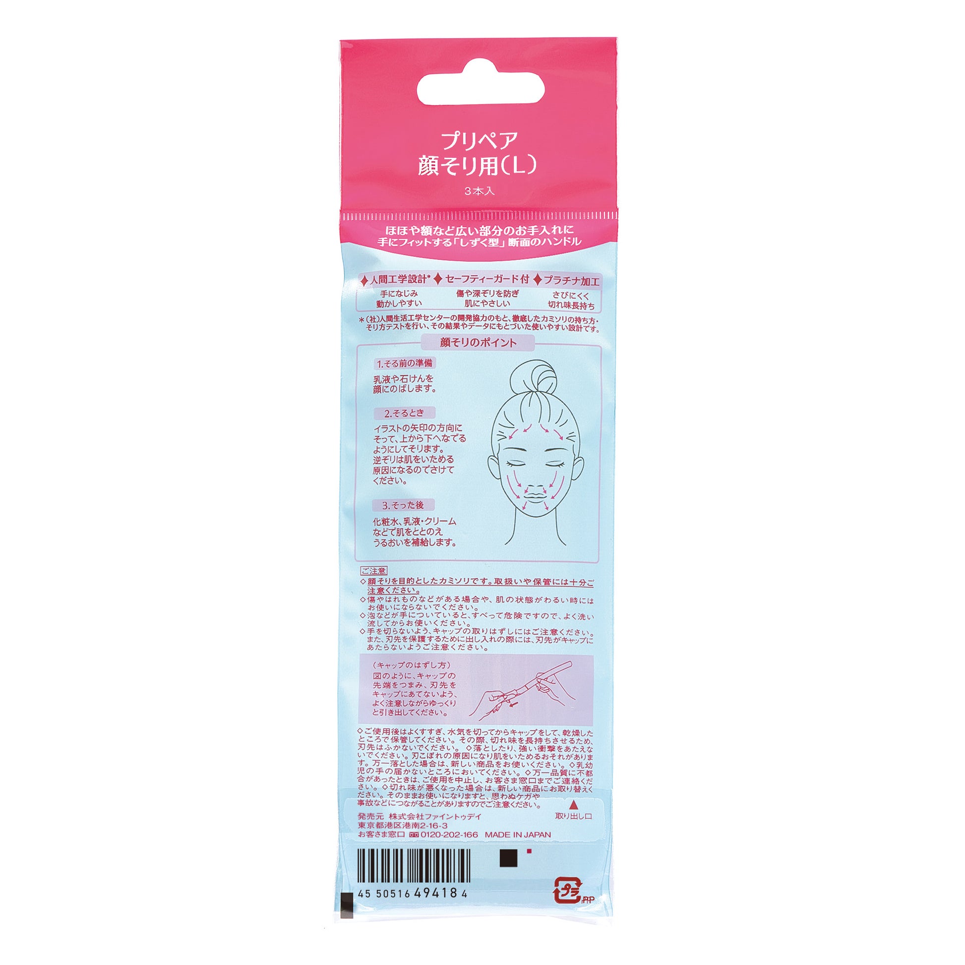 ほほや額など広い部分のお手入れに手にフィットする「しずく型」断面のハンドル手になじみ動かしやすい人間工学設計傷や深ぞりを防ぎ肌にやさしいセーフティーガード付さびにくく切れ味長持ちのプラチナ加工3本入ブランド:プリペア分類:用具・雑貨原産国:日本製造元:ファイントゥデイ本体/詰め替え:使い切りJANコード:4550516494184