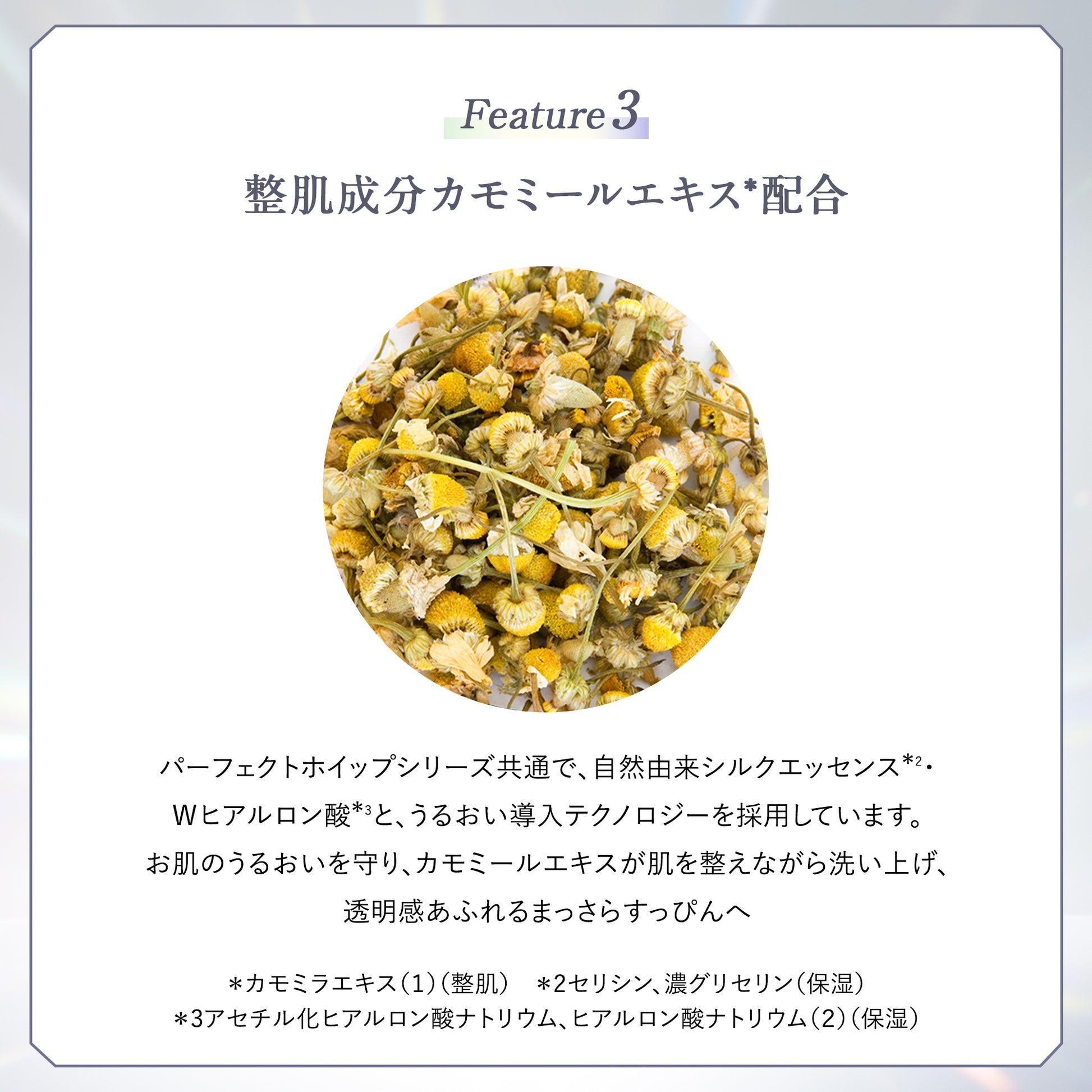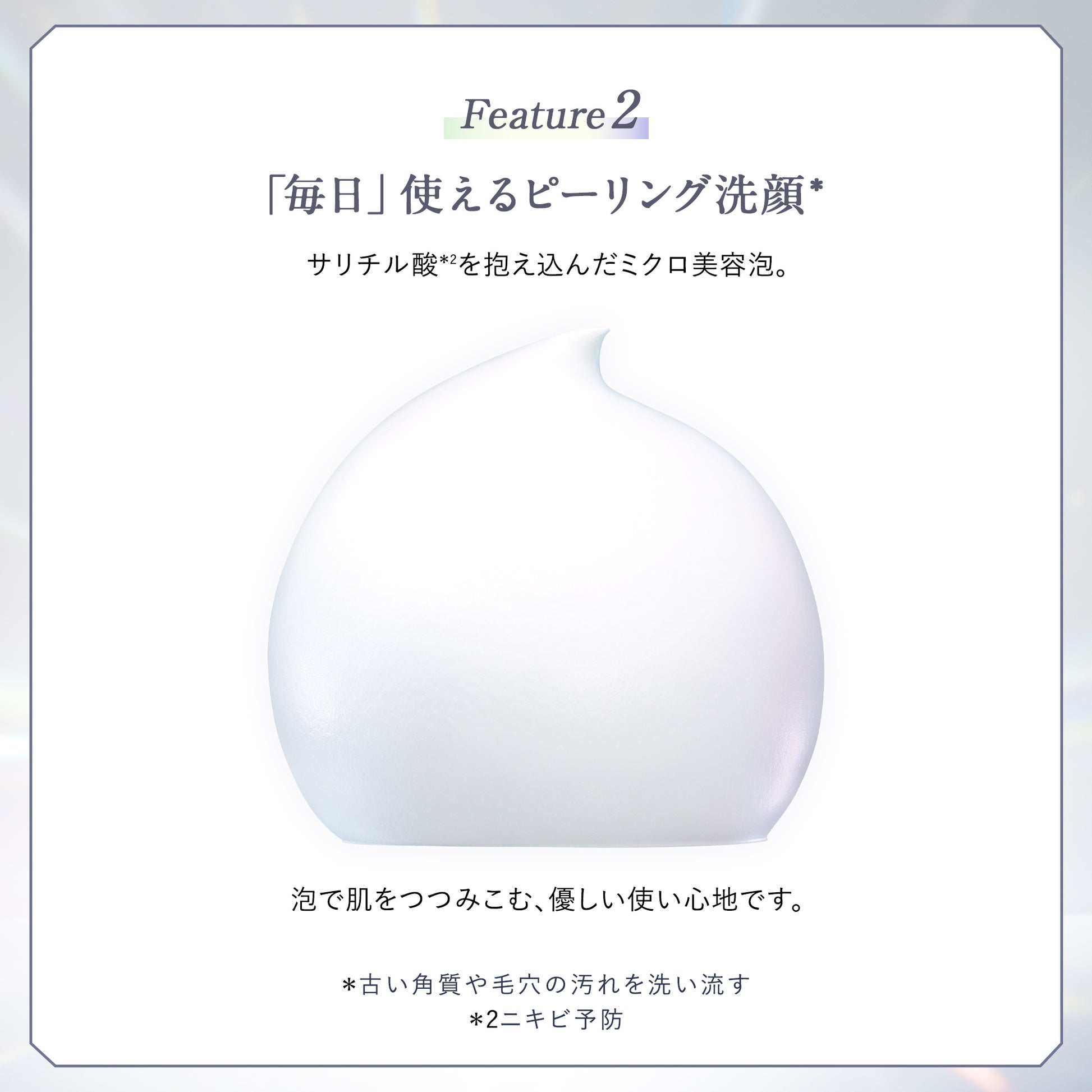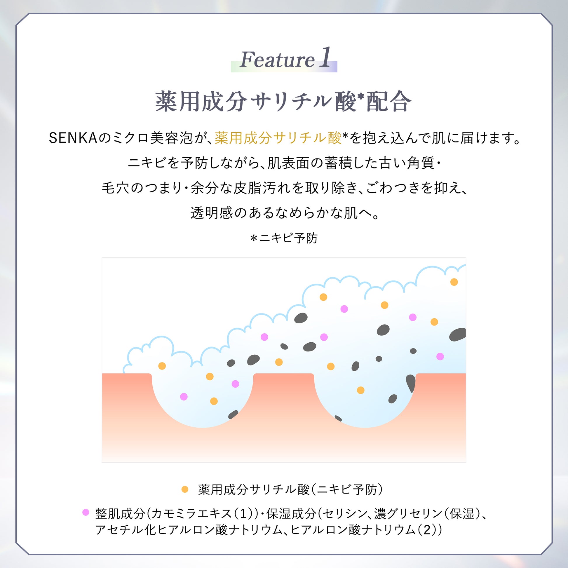 透明感あふれるまっさらすっぴんへ。美容泡ピーリング洗顔*SENKAのミクロ美容泡が、薬用成分サリチル酸(ニキビ予防)を抱え込んで肌に届ける。*古い角質や毛穴の汚れを洗い流す。上品で心地よいハーバルフルーティーな香り(販売名:SENKA パーフェクトホイップ PC)
